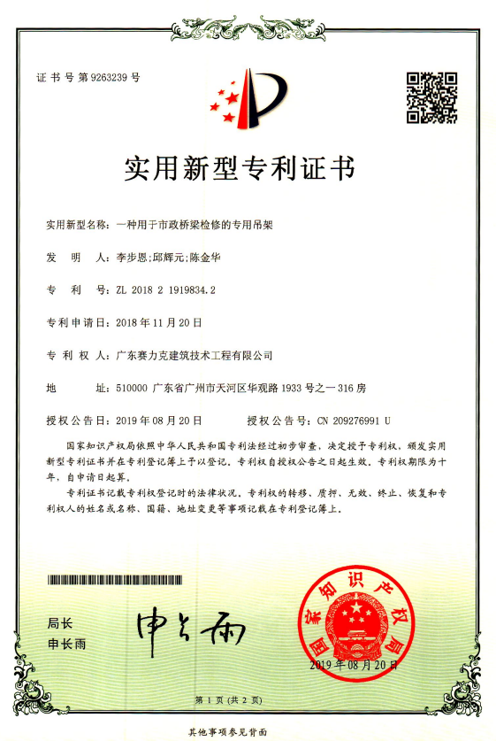瀏覽量:1461 發布時間:2019.12.07由廣東賽力克建筑技術工程有限公司研發團隊研發的“一種用于市政橋梁檢修的專用吊架”于2019年8月20日獲中華人民共和國國家知識產權局授予實用新型專利證書。專利號:ZL 2018 2 1919834.2。