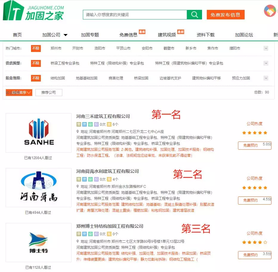 加固之家網自建立到今天已經有4年2個月2天了,我們作為國內首個建筑加固行業平臺網站,為廣大企業提供一個免費的推廣環境,眾多行內相關企業都紛紛入駐加固之家網,從加固公司——檢測鑒定公司——建筑設計院——加固材料公司,這幾個類型公司入駐平臺已達兩千家。
