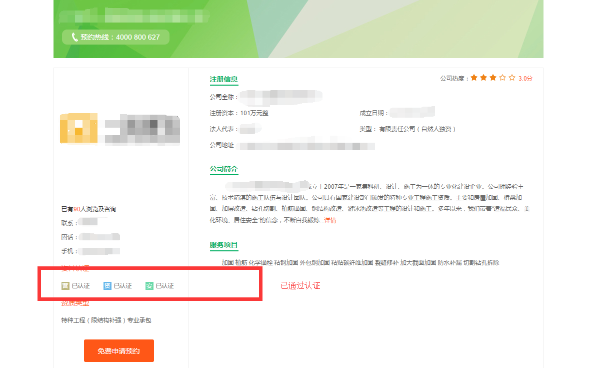 加固之家對所有注冊公司都有負責審核的任務,為了保證公司提供的證書及資料的真實性,公司必須填寫有效的公司名稱,上傳有效的證書,待后臺工作人員核實完畢即可通過認證。(下圖為已通過認證的公司,在公司主頁可看到已認證字樣)