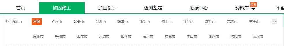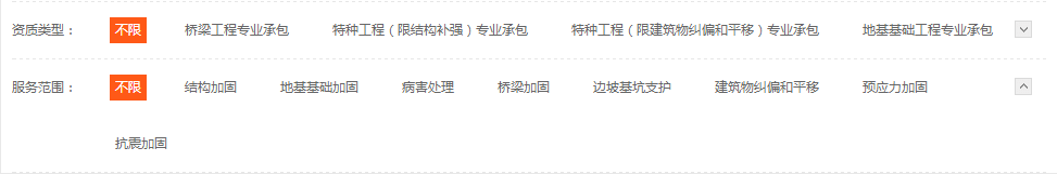 2、加固之家平臺對所有入駐企業進行了詳細的分類,業主可以根據項目特點,自主挑選不同資質類型和服務范圍的加固類企業,這里的“服務范圍”是區分各個公司其特定施工項目強項的選項。